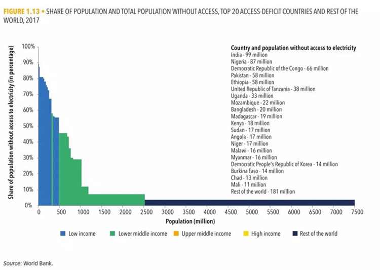 具體來(lái)說(shuō),印度依然是全球無(wú)電人口最多的國(guó)家,截至2017年底,該國(guó)有9900萬(wàn)人無(wú)法用電。位列其后的2017年底無(wú)電人口最多的國(guó)家還有:尼日利亞(8700萬(wàn))、民主剛果(6600萬(wàn))、巴基斯坦(5800萬(wàn))、埃塞俄比亞(5800萬(wàn))、坦桑尼亞(3800萬(wàn))、烏干達(dá)(3300萬(wàn))、莫桑比克(2200萬(wàn))、孟加拉國(guó)(2000萬(wàn))、馬達(dá)加斯加(1900萬(wàn))、肯尼亞(1700萬(wàn))、蘇丹(1700萬(wàn))、安哥拉(1700萬(wàn))、尼日爾(1700萬(wàn))、馬拉維(1600萬(wàn))、緬甸(1600萬(wàn))、朝鮮(1400萬(wàn))、布基納法索(1400萬(wàn))、乍得(1300萬(wàn))以及馬里(1100萬(wàn))。其他國(guó)家無(wú)電人口為1.81億。