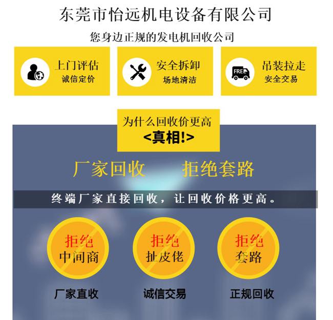 消息一經(jīng)傳出,上門談判回收事宜的回收商家絡(luò)繹不絕,這其中有廢品佬、有扯皮佬、有中間串串、只有少部份的真正做二手發(fā)電機回收的廠家。老板也是聰明人,知道賣給他們不劃算,還是得找專業(yè)的做發(fā)電機回收的。一個機緣巧合之下,他在網(wǎng)上看到怡遠(yuǎn)公司二手發(fā)電機銷售的信息,于是立刻打電話給了公司彭總,在了解到公司經(jīng)營模式及經(jīng)營狀況之后,覺得怡遠(yuǎn)確實是一家正規(guī)的終端回收商家,而且價格也比那些中間商家價格更貴,所以決定直接賣給怡遠(yuǎn)。