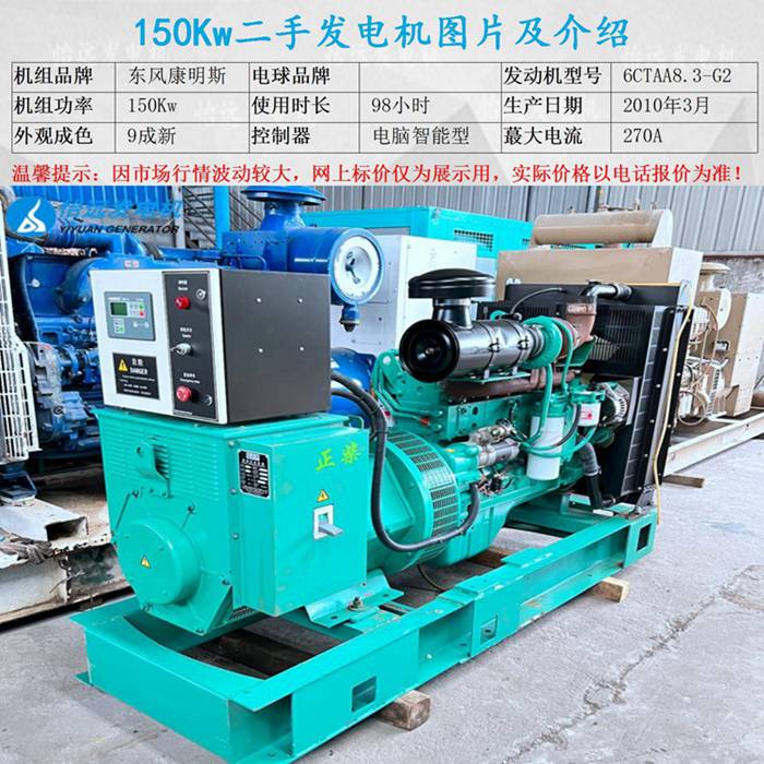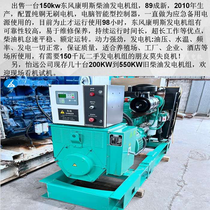 出售一臺(tái)二手150kw康明斯柴油發(fā)電機(jī)組,8成新,2010年生產(chǎn),配置純銅無刷電機(jī),電腦智能型控制器,一直做為應(yīng)急備用電源使用的,目前為止才運(yùn)行使用98小時(shí),東風(fēng)康明斯發(fā)電機(jī)組具有可靠性較高,易于維修保養(yǎng),持續(xù)運(yùn)行時(shí)間長,具有超長的工作等優(yōu)點(diǎn),柴油機(jī)怠速平穩(wěn)、額定運(yùn)轉(zhuǎn)。動(dòng)力強(qiáng)勁,發(fā)電機(jī):油壓、水溫、頻率、發(fā)電一切正常,保證質(zhì)量,適合養(yǎng)殖場、工廠、企業(yè)、酒店等場所使用,有需要150千瓦二手發(fā)電機(jī)組的朋友莫失良機(jī),可隨時(shí)到東莞怡遠(yuǎn)公司倉庫現(xiàn)場參觀試機(jī),機(jī)組經(jīng)過測試,正常發(fā)電使用。有需要的朋友請直接電話咨詢:13751213841。