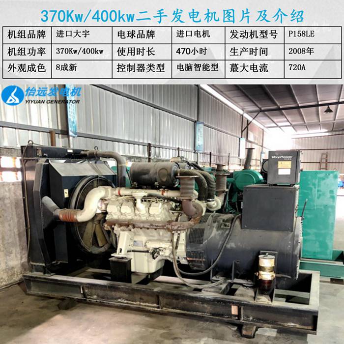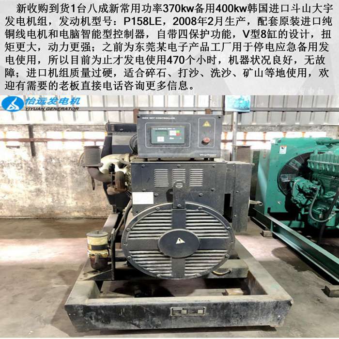 怡遠(yuǎn)公司對(duì)外轉(zhuǎn)讓一臺(tái)400kw進(jìn)口大宇二手發(fā)電機(jī)組,八成新常用功率370kw備用400kw韓國進(jìn)口斗山大宇發(fā)電機(jī)組,發(fā)動(dòng)機(jī)型號(hào):P158LE,2008年2月生產(chǎn),配套原裝進(jìn)口純銅線電機(jī)和電腦智能型控制器,自帶四保護(hù)功能,V型8缸的設(shè)計(jì),扭矩更大,動(dòng)力更強(qiáng);之前為東莞某電子產(chǎn)品工廠用于停電應(yīng)急備用發(fā)電使用,所以目前為止才發(fā)電使用470個(gè)小時(shí),機(jī)器狀況良好,無故障;進(jìn)口機(jī)組質(zhì)量過硬,適合碎石、打沙、洗沙、礦山等地使用,歡迎有400kw進(jìn)口大宇二手發(fā)電機(jī)組需要的老板直接電話咨詢更多信息:13751213841