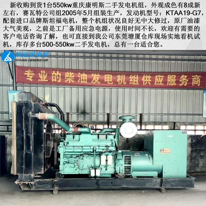 新收購(gòu)到貨1臺(tái)重慶二手康明斯550千瓦發(fā)電機(jī)組,外觀成色有8成新左右,賽瓦特公司組2005年5月組裝生產(chǎn),發(fā)動(dòng)機(jī)型號(hào):KTAA19-G7,配套進(jìn)口品牌斯坦福電機(jī),整個(gè)機(jī)組狀況良好無(wú)中大修過,原廠油漆大氣美觀,之前是工廠備用應(yīng)急電源,使用時(shí)間不長(zhǎng),歡迎有需要的客戶電話咨詢了解,也可直接到我公司東莞塘廈倉(cāng)庫(kù)現(xiàn)場(chǎng)實(shí)地看機(jī)試機(jī),庫(kù)存多臺(tái)500-550kw二手發(fā)電機(jī),總有一臺(tái)適合您。歡迎有二手康明斯550千瓦發(fā)電機(jī)需要的老板直接來電咨詢:13751213841