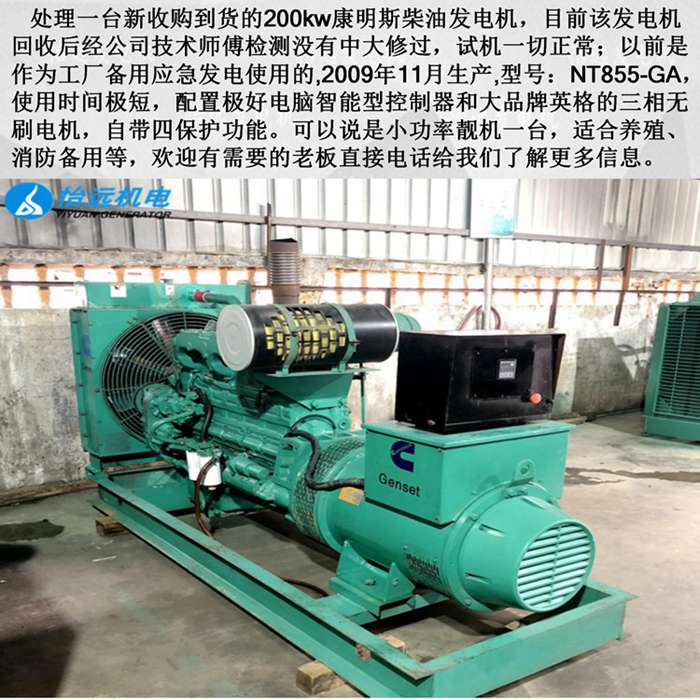 處理一臺新收購到貨的二手康明斯發(fā)電機組200kw,目前該發(fā)電機回收后經(jīng)公司技術(shù)師傅檢測沒有中大修過,試機一切正常;以前是作為工廠的備用應(yīng)急發(fā)電使用的,2009年11月生產(chǎn),型號:NT855-GA,使用時間極短,配置極好電腦智能型控制器和大品牌英格的三相無刷電機,自帶四保護功能??梢哉f是小功率靚機一臺,適合養(yǎng)殖、消防備用等,歡迎有需要的老板直接電話咨詢我們了解更多信息:13751213841