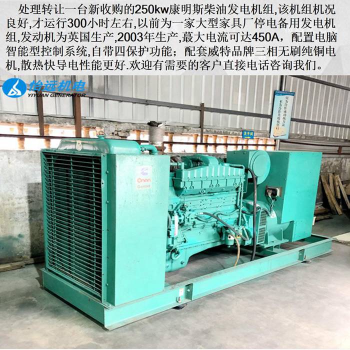 二手250kw柴油發(fā)電機(jī)價(jià)格 介紹: 處理轉(zhuǎn)讓一臺新收購的250kw康明斯柴油發(fā)電機(jī)組,該發(fā)電機(jī)組機(jī)況良好,才運(yùn)行300小時(shí)左右,以前為一家大型家具廠停電應(yīng)急備用發(fā)電機(jī)組,發(fā)動機(jī)為英