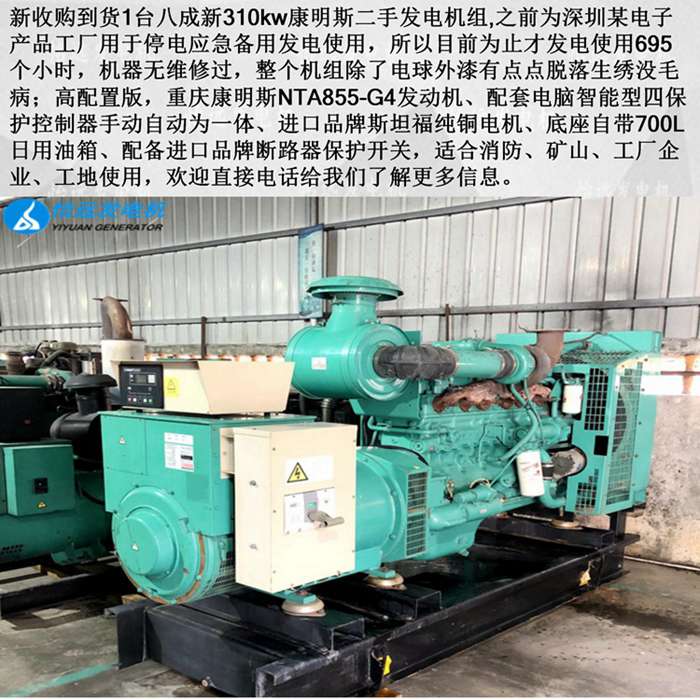 二手300kw發(fā)電機(jī)組產(chǎn)品介紹: 機(jī)組品牌:重慶康明斯 電球品牌:進(jìn)口斯坦福電機(jī) 發(fā)動(dòng)機(jī)型號(hào):NTA855-G4 機(jī)組功率:300Kw 使用時(shí)長:695小時(shí) 外觀成色:8成新 控制器類型:電腦智能型 蕞大