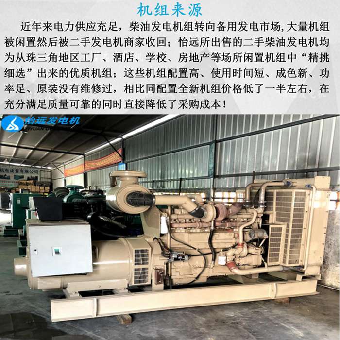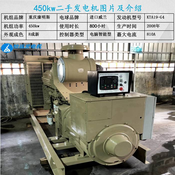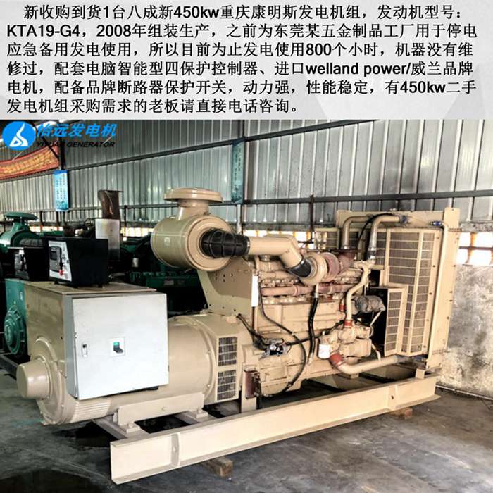 新收購到貨1臺八成新450kw重慶康明斯發(fā)電機(jī)組,發(fā)動機(jī)型號;KTA19-G4,2008年組裝生產(chǎn),之前為東莞某五金制品工廠用于停電應(yīng)急備用發(fā)電使用,所以目前為止發(fā)電使用800個小時,機(jī)器沒有維修過,配套電腦智能型四保護(hù)控制器、進(jìn)口welland power/威蘭品牌電機(jī),配備品牌斷路器保護(hù)開關(guān),動力強(qiáng),性能穩(wěn)定,有450kw二手發(fā)電機(jī)組采購需求的老板請直接電話咨詢:13751213841