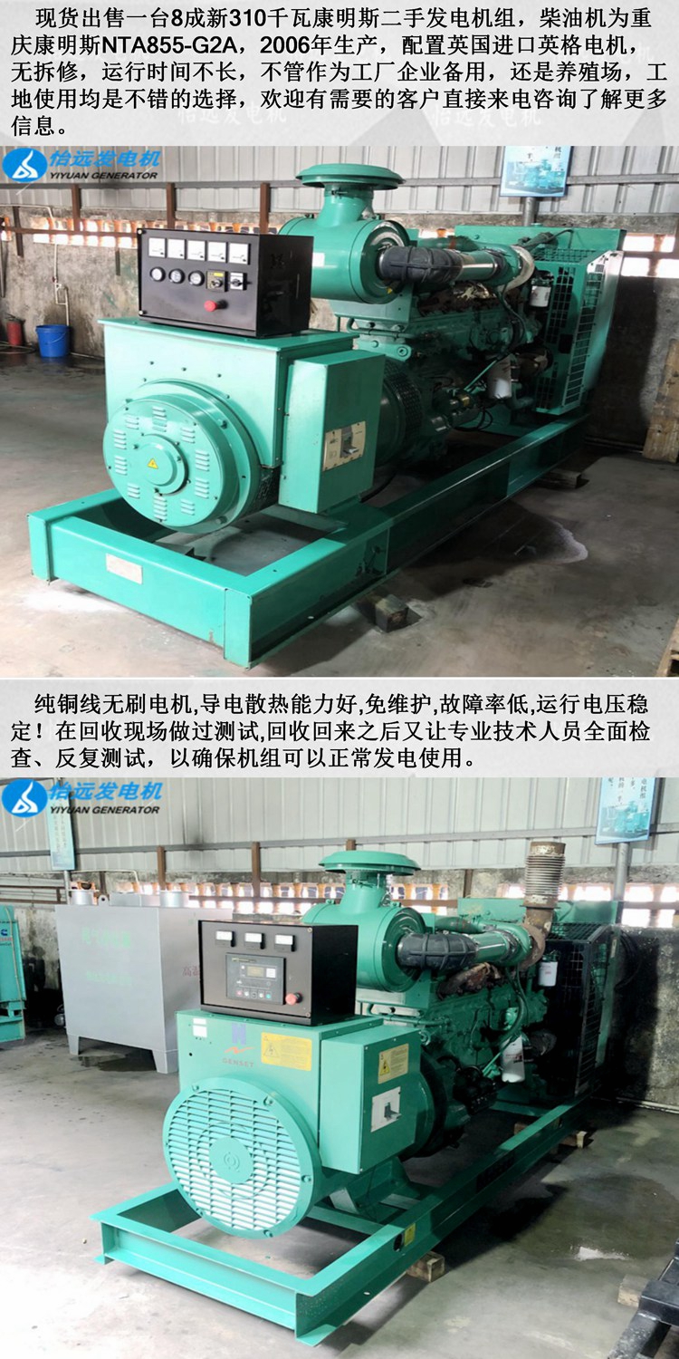 現(xiàn)貨出售一臺(tái)8成新310千瓦康明斯二手發(fā)電機(jī)組,柴油機(jī)為重慶康明斯NTA855-G2A,2006年生產(chǎn),配置英國(guó)進(jìn)口英格電機(jī),無拆修,運(yùn)行時(shí)間不長(zhǎng),不管作為工廠企業(yè)備用,還是養(yǎng)殖場(chǎng),工地