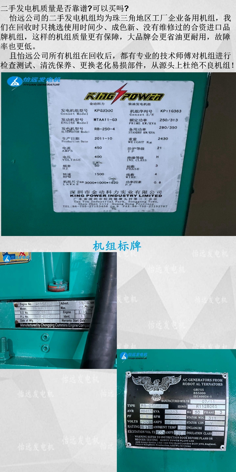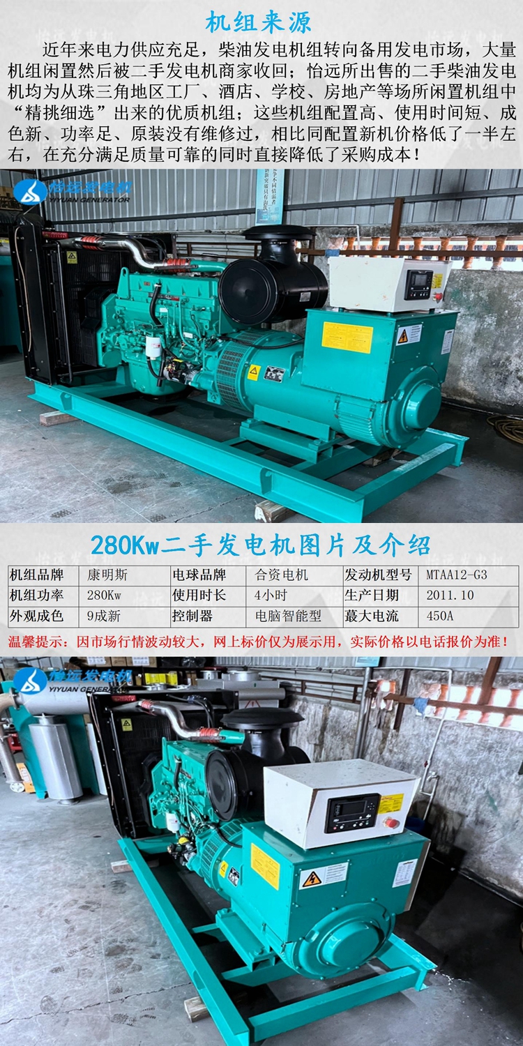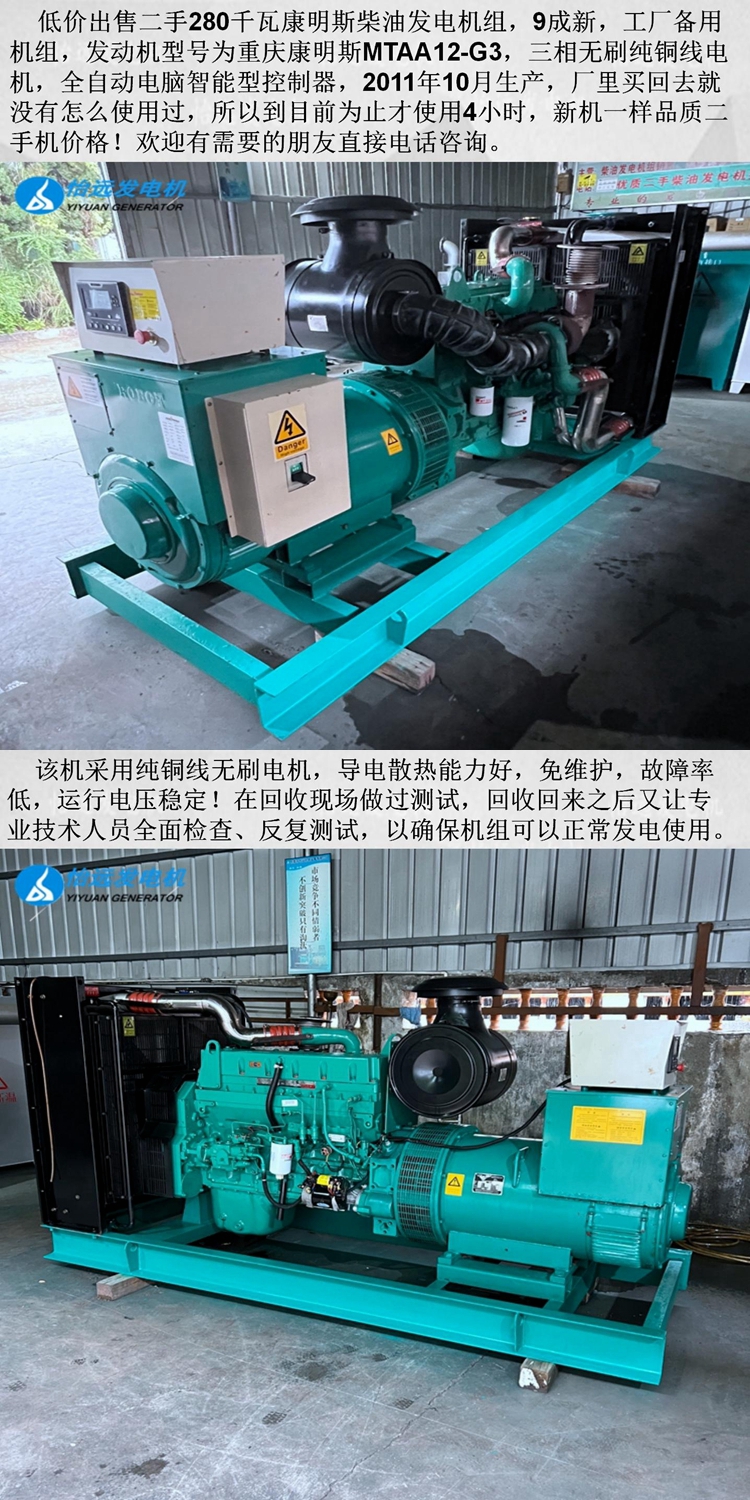 出售280千瓦二手康明斯柴油發(fā)電機組,9成新,工廠備用機組,發(fā)動機型號為重慶康明斯MTAA11-G3,三相無刷純屬=銅線電機,全自動電腦智能型控制器,2011年10月生產(chǎn),廠里買回去就沒有怎么使用過,所以到目前為止才使用4小時,新機一樣品質(zhì)二手機價格!歡迎有需要的朋友直接電話咨詢137 5121 3841。
