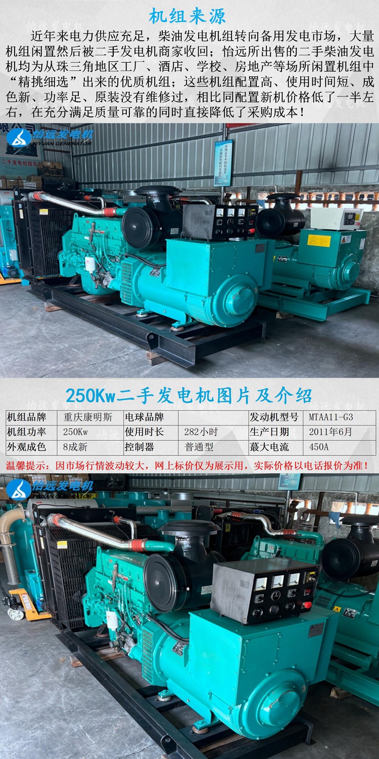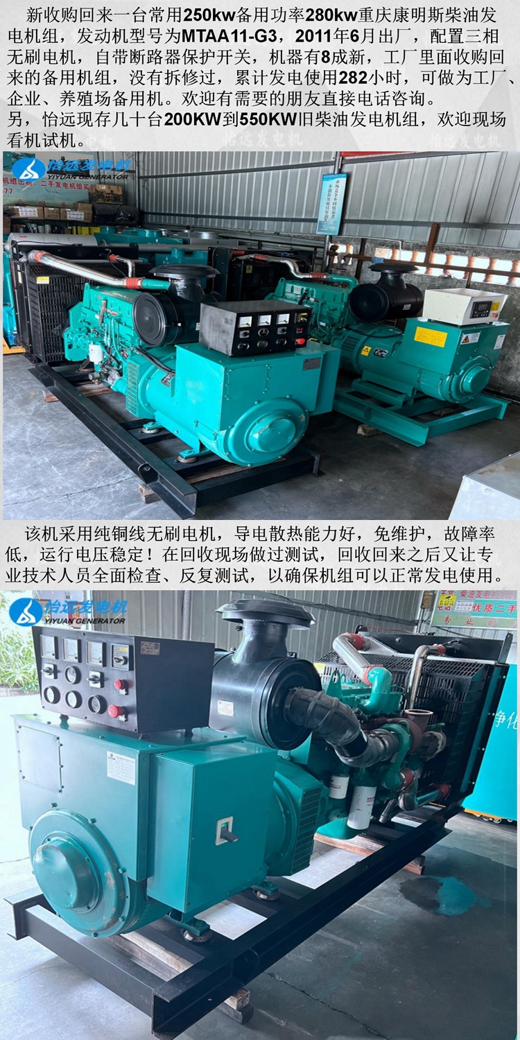 新收購回來一臺二手250kw 康明斯柴油發(fā)電機(jī)組, 常用250kw備用功率280kw,發(fā)動機(jī)型號為MTAA11-G3,2011年6月出廠,配置三相無刷電機(jī),自帶斷路器保護(hù)開關(guān),機(jī)器有8成新,工廠里面收購回