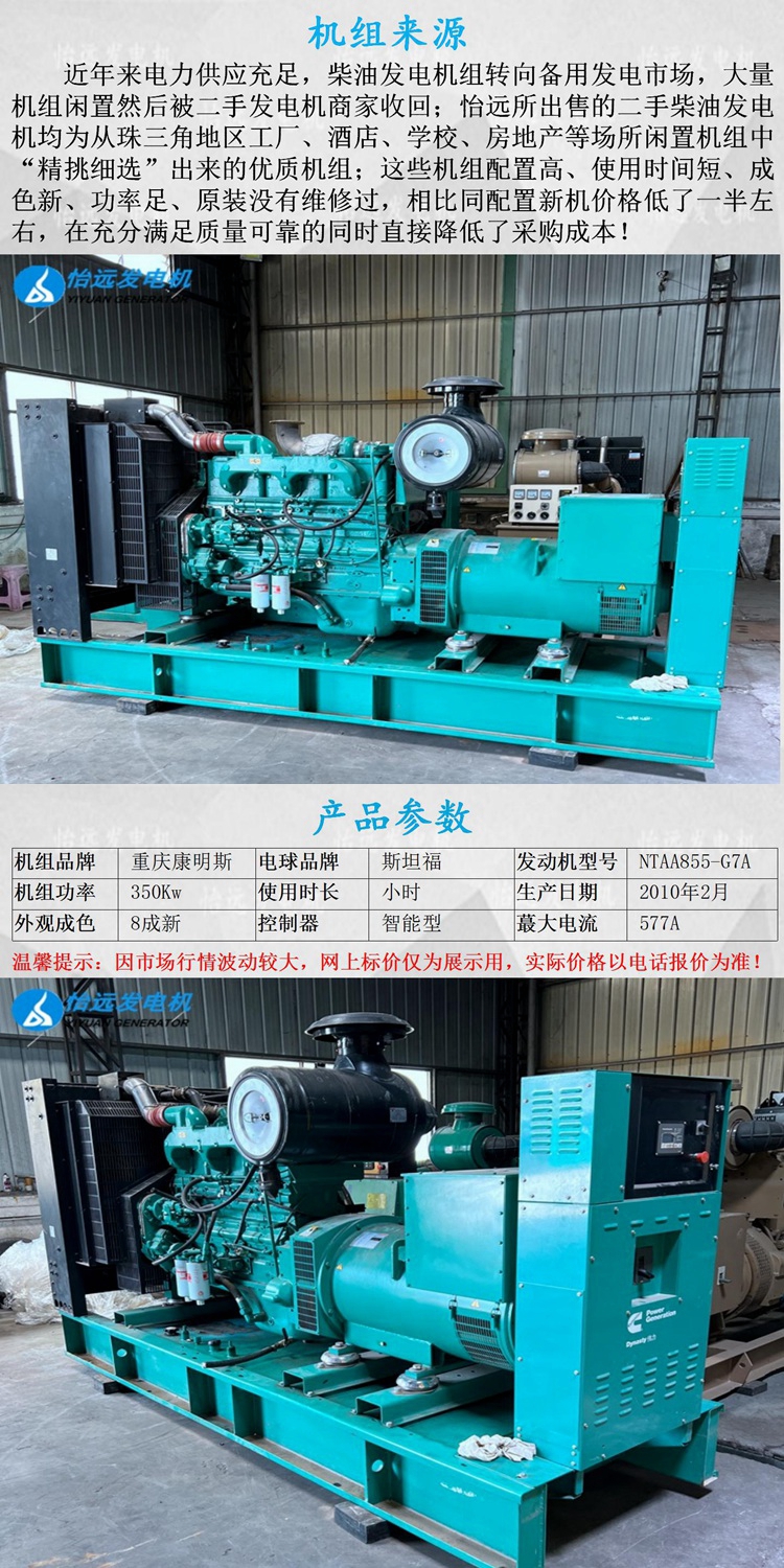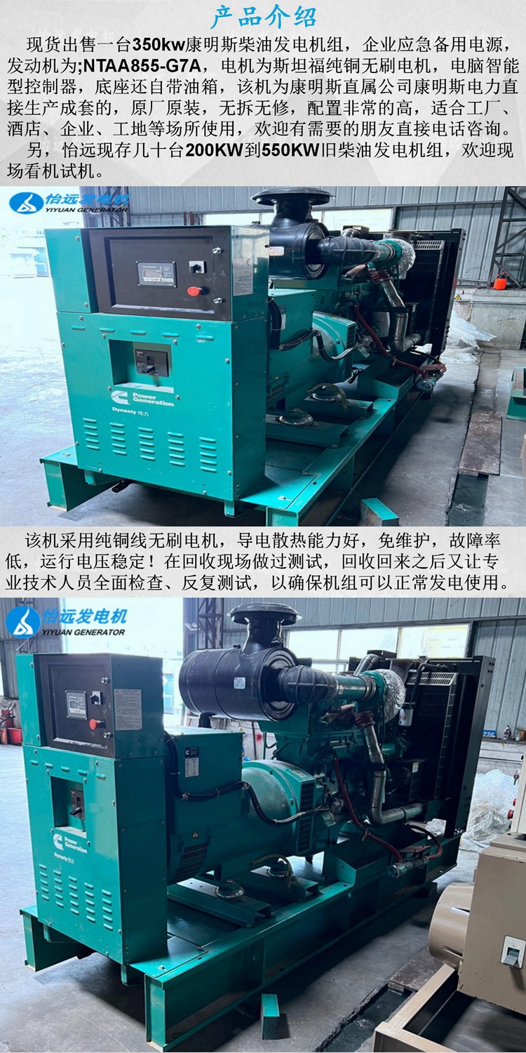 現(xiàn)貨出售一臺(tái)二手350kw康明斯柴油發(fā)電機(jī)組,企業(yè)應(yīng)急備用電源,發(fā)動(dòng)機(jī)為;NTAA855-G7A,電機(jī)為斯坦福純銅無刷電機(jī),電腦智能型控制器,底座還自帶油箱,該機(jī)為康明斯直屬公司康明斯電力直接生產(chǎn)成套的,原廠原裝,無拆無修,配置非常的高,目前為止僅運(yùn)行使用52小時(shí),適合工廠、酒店、企業(yè)、工地等場所使用,歡迎有需要的朋友直接電話咨詢:137 5121 3841