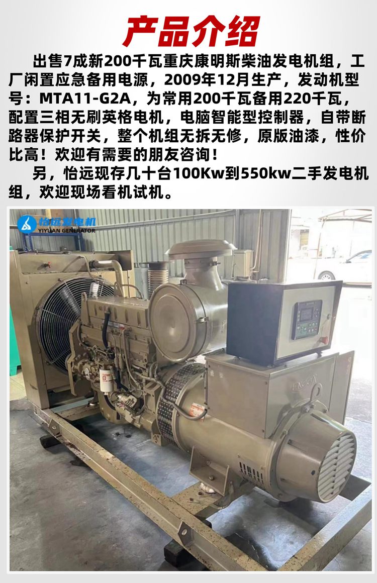 出售7成新二手200千瓦重慶康明斯柴油發(fā)電機組,工廠閑置應急備用電源,2009年12月生產,發(fā)動機型號:MTA11-G2A,為常用200千瓦備用220千瓦,配置三相無刷英格電機,電腦智能型控制器,自帶斷路器保護開關,整個機組無拆無修,原版油漆,性價比高!歡迎有需要的朋友咨詢:13751213841
