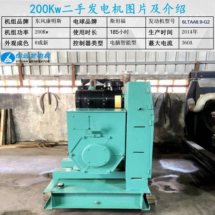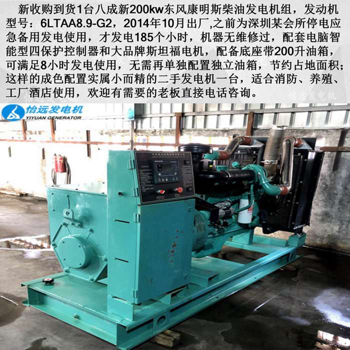 新收購到貨1臺八成新200kw東風康明斯柴油發(fā)電機組,發(fā)動機型號:6LTAA8.9-G2,2014年10月出廠,之前為深圳某會所用于停電應急備用發(fā)電使用,所以目前為止才發(fā)電使用185個小時,機器無維修過,配套電腦智能型四保護控制器和大品牌斯坦福電機,配備座帶200升油箱,可滿足8小時發(fā)電使用,無需再單獨配置獨立油箱,節(jié)約占地面積;這樣的成色配置實屬小而精的二手發(fā)電機一臺,適合消防、養(yǎng)殖、工廠酒店使用,歡迎有二手東風康明斯發(fā)電機200千瓦需要的老板直接電話咨詢:13751213841